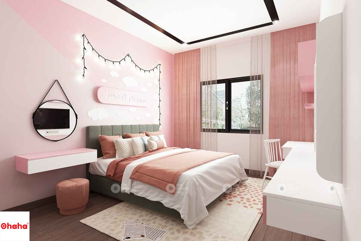 Thiết kế phòng ngủ mang phong cách nhẹ nhàng, tiểu thư với tông màu hồng pastel được phái nữa ưa thích và lựa chọn khá nhiều. Phong cách này phù hợp với các cô nàng đáng yêu, có tính cách hoạt bát, thể hiện được sự tươi trẻ mà lại có chút dịu dàng trong đó.