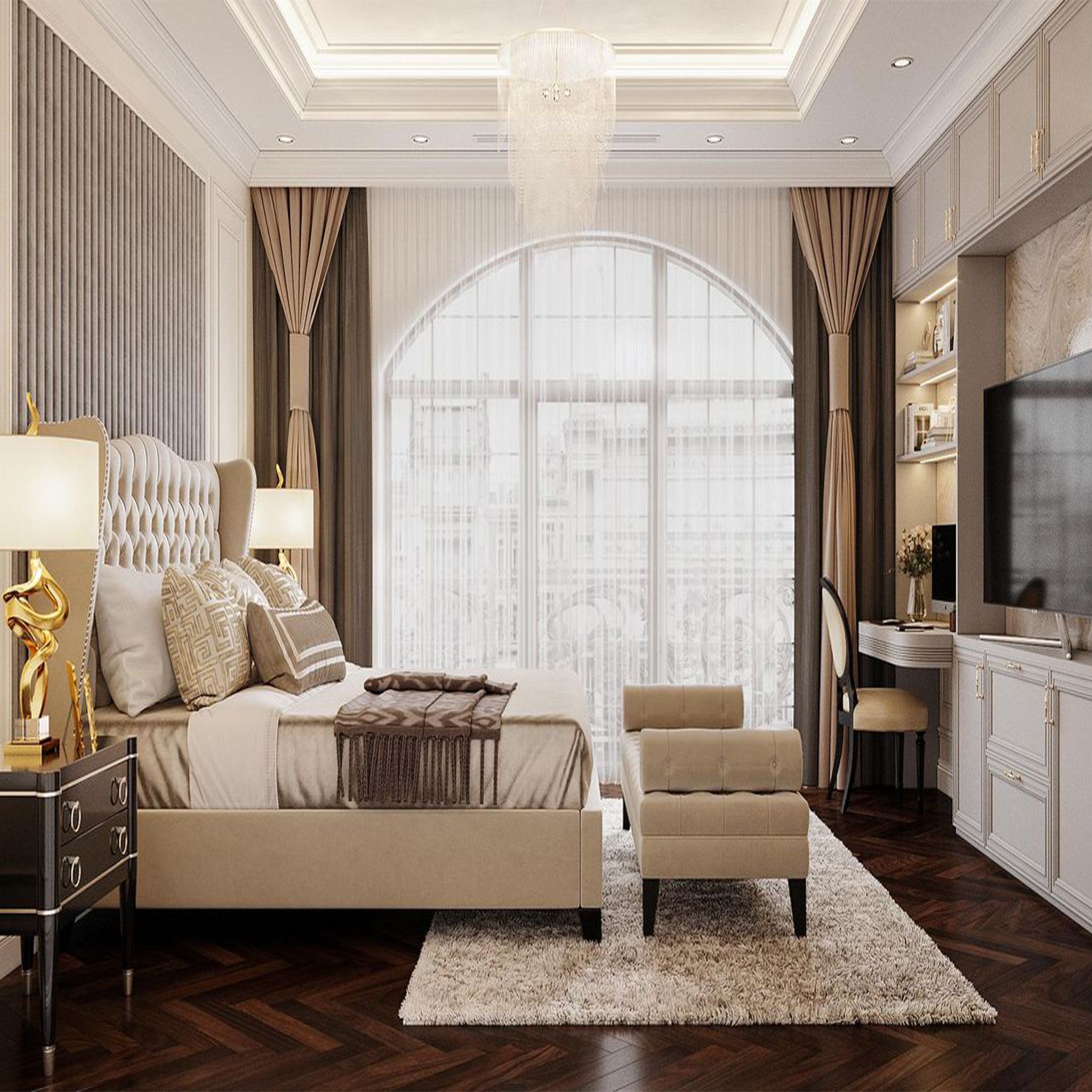 Tân cổ điển là phong cách khá được ưa chuộng trong thiết kế phòng ngủ căn hộ. Đặc biệt đối với những người yêu thích sự sang trọng, tinh tế mang phong cách cổ điển Châu Âu hoặc cổ điển Ý. Phòng ngủ tân cổ điển toát lên một nét đẹp kiêu sa và lộng lẫy. Những đường nét họa tiết vô cùng tinh tế kết hợp với đồ nội thất chất liệu cao cấp, hài hòa tạo nên một nét đặc trưng, độc đáo cho phòng ngủ của gia chủ.
